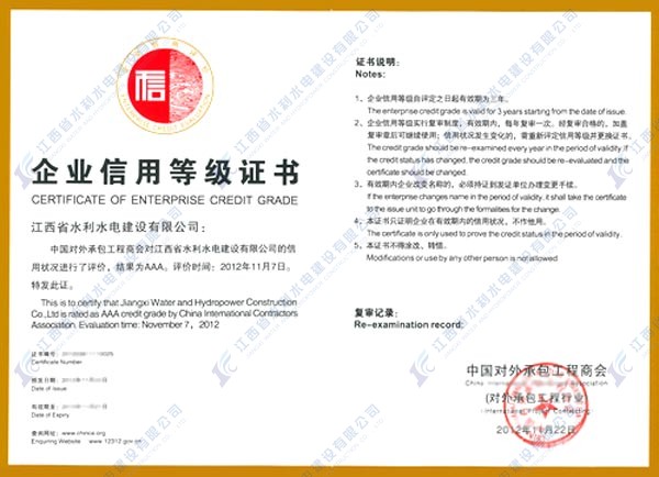 根據(jù)商務(wù)部、國(guó)資委聯(lián)合發(fā)布的《商會(huì)協(xié)會(huì)行業(yè)信用建設(shè)工作指導(dǎo)意見》的要求,中國(guó)對(duì)外承包工程商會(huì)于2012年9月啟動(dòng)2012年度對(duì)外承包工程與勞務(wù)合作企業(yè)信用等級(jí)評(píng)價(jià)工作。經(jīng)對(duì)外承包工程與勞務(wù)合作企業(yè)信用等級(jí)評(píng)審委員會(huì)第八次工作會(huì)議審議,江西省水利水電建設(shè)有限公司被評(píng)定為2012年度對(duì)外承包工程企業(yè)信用評(píng)價(jià)AAA級(jí)信用企業(yè)。