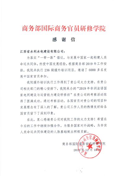 2019年,公司圍繞國家和我省“走出去”戰(zhàn)略,積極配合商務(wù)部及省內(nèi)援外培訓(xùn)工作,得到各方認(rèn)可。近日,公司收到來自商務(wù)部國際商務(wù)官員研修學(xué)院的感謝信,信中提到,商務(wù)部研修學(xué)院援外培訓(xùn)工作得到我公司的大力支持,“2019年非洲法語國家電網(wǎng)建設(shè)與運(yùn)營(yíng)能力建設(shè)研修班”考察、交流活動(dòng)取得圓滿成功,對(duì)公司的積極配合表示衷心感謝。