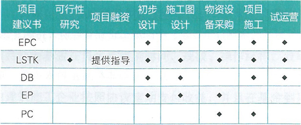 常見的工程總承包方式。工程總承包的主要方式有:設計采購施工總承包(EPC )、交鑰匙工程總承包 (LSTK )、設計建造工程總承包(DB )、設計采購總承包 (EP )、采購施工總承包(PC )。不同的承包方式,參與項目實施過程中的不同環節(見表1 )。