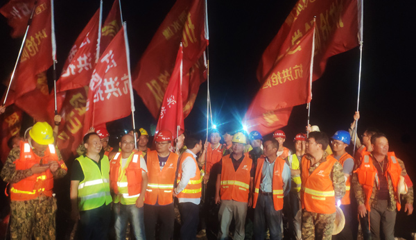 7月13日下午,公司完成封堵工作技術測量和封堵工作技術方案制定,7月13日晚上,搶險技術、施工人員及設備陸續進場,并調配塊石、砂礫石等各類材料進場。決口封堵采取南北兩岸同時進占方式施工, 7月14日中午14時開始進占施工,經過兩天兩夜連續55個小時施工作業,于7月16日晚上21時43分,完成決口合攏,比預計完工時間提前50小時。